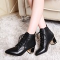春秋女靴系带新款真皮短靴 牛皮休闲女靴中跟尖头前系带马丁靴